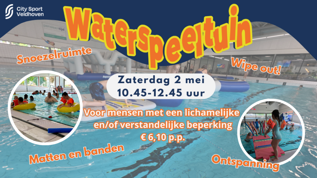 Zwemclub ’t Zeepaardje en City Sport Veldhoven en organiseren voor het tweede jaar op rij de Waterspeeltuin. Een warm, sportief en vooral toegankelijk evenement voor mensen met een verstandelijke en/of lichamelijke beperking. Op 2 mei 2026 staat het zwembad van 10.45 tot 12.45 uur helemaal in het teken van plezier, ontmoeting en bewegen op eigen niveau.